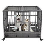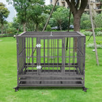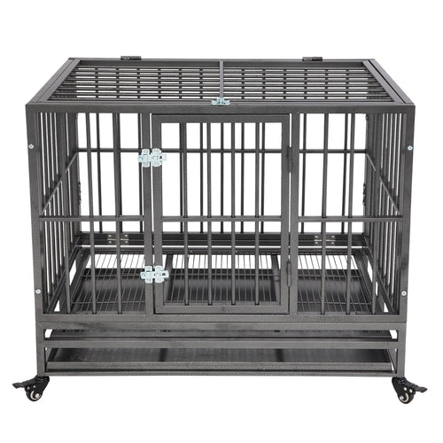 This is our brand new heavy duty strong dog cage with wheel. This cage is designed in particular with a heavy duty steel frame, a perfect choice for you to keep your pets safe and comfortable. Each bar is firmly welded to ensure the strongest sturdy construction. Double-door design with one in front and the other on top allow easy access to our pet. You can change food and water for your pet from the front door. When you want to take your pet out from the cage, the door on the top will work. The front door has double latches and top door with one, which are quite strong to protect our pet from escaping. Grate design floor allows dirties to drop down to the below tray, keep a clean environment for pets. Both of the grate floor and steel tray can be easily slide out from the bottom for easy and convenient cleaning. Besides, the cage is equipped with four rolling casters for easy moving and two of them are lockable design to avoid accidental moving.